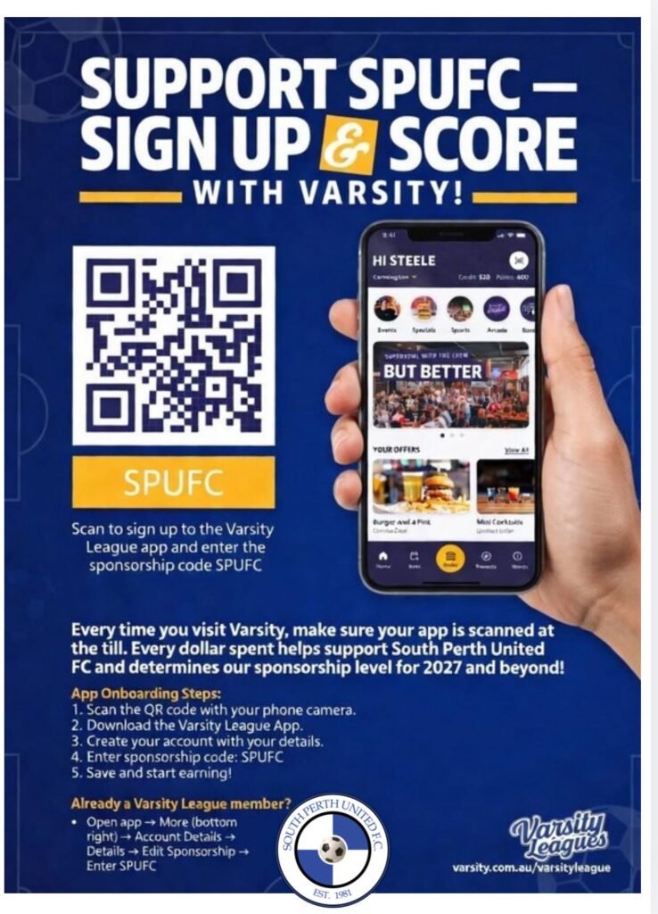 Varsity Waterford is a key sponsor of South Perth United FC! Even better, when you visit Varsity, you help secure our future sponsorship – just download the Varsity League app, enter the sponsorship code ‘SPUFC’, and make sure you scan the app every time you order at Varsity.